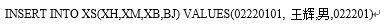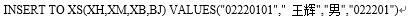 学生表(XS.DBF)的表结构为:学号(C,8),姓名(C,8),性别(C,2),班级(C,6)用Insert命令向XS表添加一条新记录,记录内容为:学号为02220101姓名为王辉性别为男班级为022201。下列命令中正确的是()