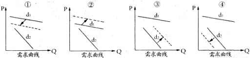2013年11月15日,我国成品油价格再次下调,也是今年内首次出现“三年降”。假设下图(P为价格,Q为需求量)d1和d2中有一条是汽车需求曲线,另一条是某生活必需品需求曲线,受汽油价格下调的影响,在其他因素不变的情况下,下图移动的线是汽车需求曲线的可能是()。