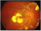 男性,52岁,诉左眼眼痛并眼前黑影3天,否认外伤史。眼科检查VOD1.0,VOSCF/眼前,IOPOD17mmHg,IOPOS28mmHg。左眼结膜充血,角膜透明,瞳孔圆,4mm,光反应(+),晶状体透明,玻璃体膛内可见大量白色絮状混浊。视盘边界欠清,网膜灰白色隆起,可见大量黄白色斑块状病灶及散在片状出血,血管迂曲,动脉周围可见白色血管鞘,部分血管闭塞。