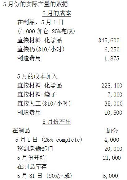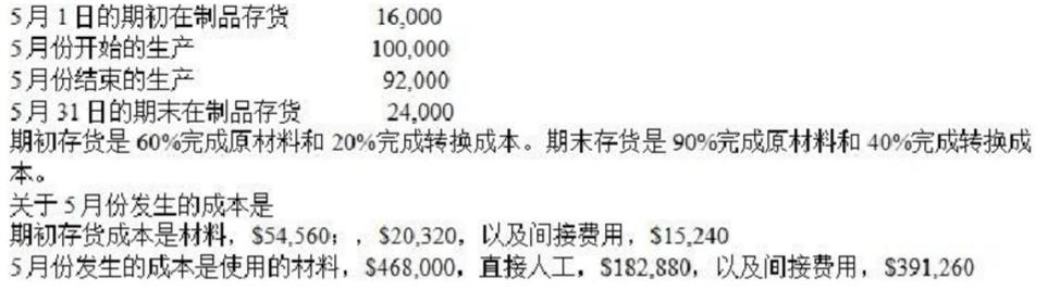 在5月份,即当生产过程发生一个变化前,在制品库存是无关紧要的。之后生产过程的变化可以得到更大的产能,但会在第一次导致大量在制品。公司一直使用加权平均法来确定约当产量和单位成本。现在,生产管理者正在考虑将加权平均法改成先进先出法。