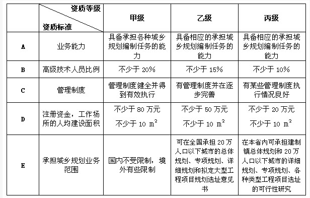 城乡规划编制资质分为甲、乙、丙三级,各级标准的某些项目及其承担规划任务的范围见下表: