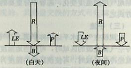 下图中,R代表(),P代表以乱流热交换方式进入空气的(),B代表以()方式进入下层土壤的热通量,LE代表用于()的热量。