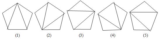 一个凸N边形,可以用N-3条互不相交的对角线将凸N边形分成N-2个三角形,这称为凸N边形的一种三角剖分。例如N=5时,共有以下5种三角剖分: