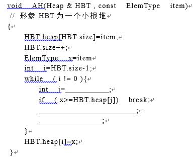 下面的算法功能是向HBT堆中插入一个值为item的元素,使得插入后仍是一个堆。请在画有横线的地方填上合适的语句,完成其功能。