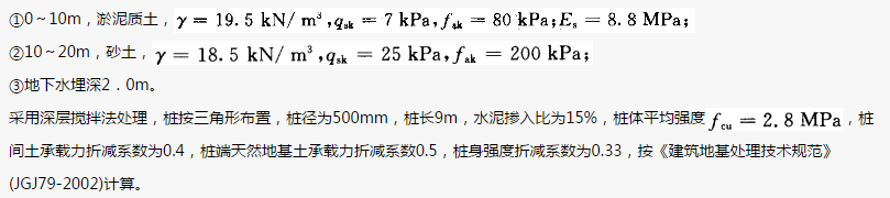,采用粉体喷搅法处理,桩径为600mm,桩距为1.2m,正方形布桩,桩长为10m,桩间土承载力折减系数为0.5,桩端天然地基土承载力折减系数为0.6,桩体材料