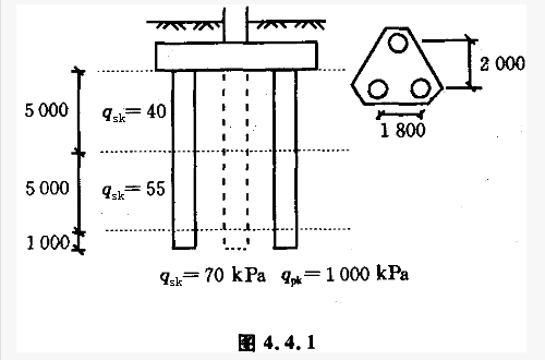 某承台下设三根桩,桩型为600mm钻孔灌注桩(干作业),桩长11m,各层土的厚度、侧阻、端阻如图4.4.1所示。基桩竖向承载力特征值为()。