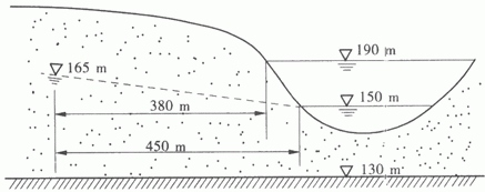 如图所示,某平原水库河谷平缓开阔,水库蓄水前河水位高程为150m,水库设计正常蓄水位为190m。水库左岸一段库岸由弱透水的土层组成,表部为农田。经勘察,在距库岸450m处地下水位为165m,该处的透水层底板高程为l30m,透水层底板近于水平,其下为不透水的黏土层。不考虑地表人渗因素,水库蓄水后,该处的地下水位高程约为()m。