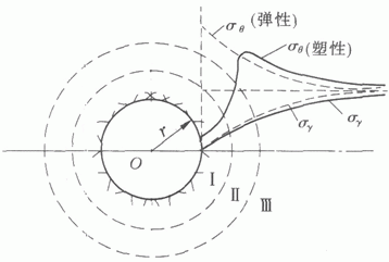 图中,一般情况下,对于岩体的径向应力在Ⅰ、Ⅱ、Ⅲ区的变化规律,下面正确的是()。