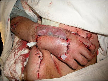 F:创面清创彻底,碘伏外敷,无菌纱布包扎