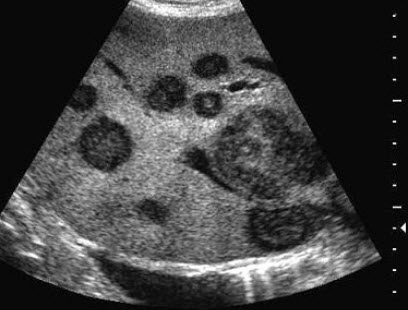 女性,59岁,右上腹痛。腹胀1周。病人于1991年因直肠癌行手术治疗。如果拟诊为继发性肝癌,超声表现错误的是( )