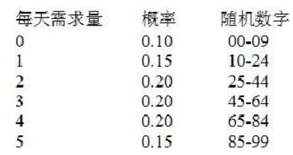 Janet Jones是All Purpose加热器公司的分析师。她计划使用蒙特卡罗(Monte Carlo)实验来模拟 All Purpose加热器的每天需求量。对加热器的每天需求的概率分布,以及分配给每个结果的随机数字间隔如下图所示: