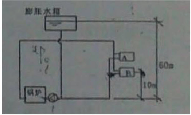 B点位铸铁散热器,工作压力为600KPa,循环水泵的扬程为28m,锅炉阻力8m,求由水泵出口至B点的压力降至少约为下列哪一项时,才安全运行()
