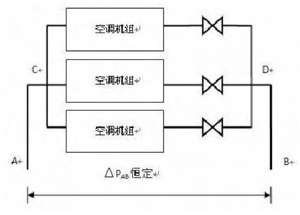 某空调系统三个相同的机组,末端采用手动阀调节,如图所示。设计状态为:每个空调箱的水流量均为100kg/h,每个末端支路的水阻力均为90kPa(含阀门、盘管及支 管和附件等);总供、回水管的水流阻力合计为△PAC+PDB=30kPa。如果A、B两点的供、回水压差始终保持不变,问:当其中一个末端的阀门全关后,系统的水流量为多少()