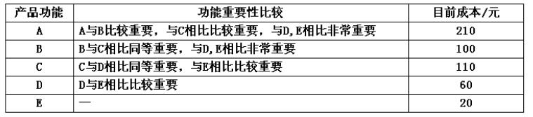 某产品由A,B,C,D,E共5项功能,各功能的目前成本测算和功能重要性比较结果见相关数据表,目标成本为450元,试确定其价值工程的改进目标。