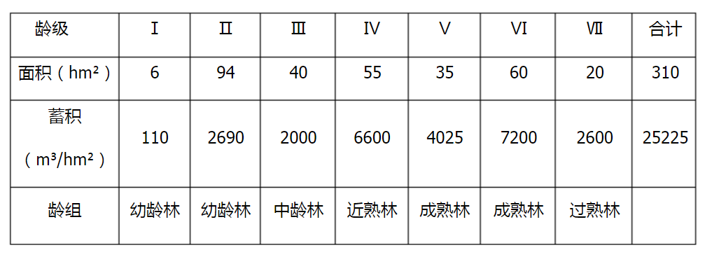 某杉木Ⅱ级地位级用材林经营类型各龄级面积和蓄积见下表,该经营类型轮伐期为25年,5年一个龄级,按林况采伐的面积60hm²,采伐蓄积为6300m³,采伐年限为5年。试用区划轮伐法、成熟度法、林龄公式、林况公式、平均生长量法计算其年伐量。