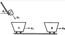 如图所示,两小车A、B的质量分别为mA=1000kg,mB=2000kg,在水平直线轨道上分别以匀速vA=2m/s和vB=1.2m/s运动。一质量为mC=200kg的重物以俯角φ=60°,速度vC=4m/s落入A车内。当A车与B车相碰后紧接在一起运动。若不计水平向摩擦,则两车一起运动的速度为()。