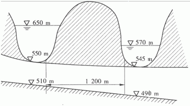 cm/s,水库侧顶板高程为550m,底板高程为510m;邻谷侧顶板高程为545m,底板高程为490m。水库正常蓄水位为650m,邻谷水位为570m。该透水层的单宽渗漏量约为()m