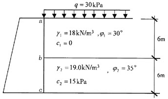 图示挡土墙,墙后填土的性质指标如图示,试用朗肯理论计算并画出图示挡土墙上的主动土压力分布图,并计算其合力大小。