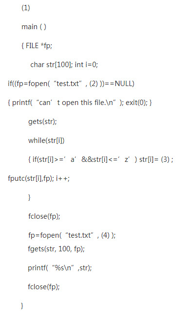 以下程序的功能是从键盘输入一个字符串,将该字符串中的小写字母转换为大写字母,输出到文件test.txt中,然后从该文件读出字符串并显示出来。请填空。