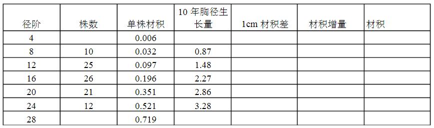 ),结果如下表。根据表中的数据计算,并计算林分过去10年和预估未来10年林分蓄积生长率。