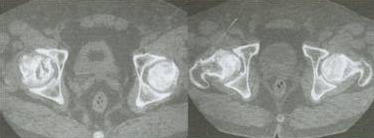 E:CT见股骨头塌陷碎裂,股骨头内见斑片状、条带状钙质样高密度硬化和软组织密度透光区