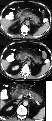 男,32岁,上腹部持续性疼痛,放射至胸背部,高热,恶心呕吐,上腹部压痛反跳痛,CT检查如图,最佳的诊断是( )