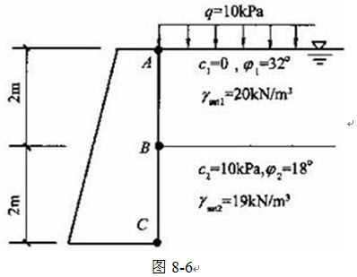 如图8-6所示挡土墙,高4m,墙背直立、光滑,墙后填土面水平。试求总侧压力(主动土压力与水压力之和)的大小和作用位置。