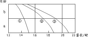 (单选题)若此图表示南半球三地的白昼变化,则a、b两月分别是()