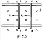 如图7-2所示,金属导轨上放置着ab和cd两根金属棒,各长1m,电阻均为4Ω,均匀磁场B-2T,方向垂直向里,当ab以ν1=4m/s,cd以ν2=2m/s的速度向左运动时,a、b两点间的电压UB=()V(忽略导轨电阻)。