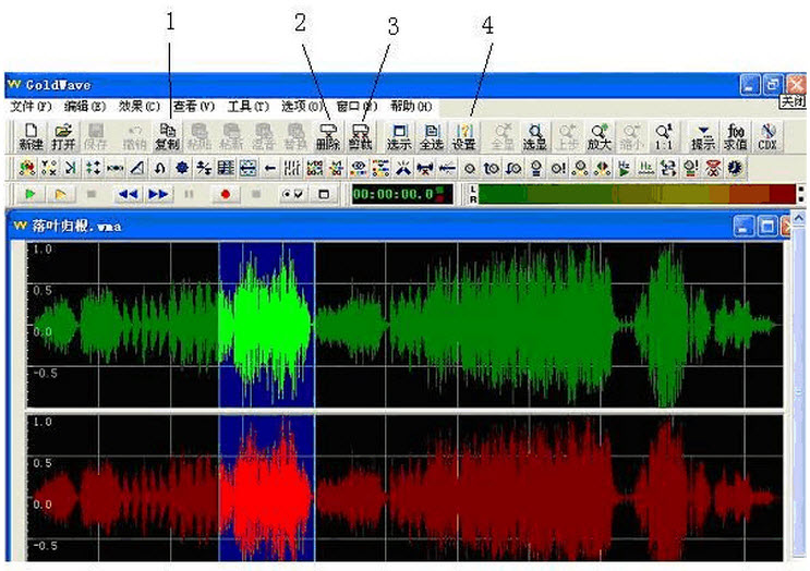 小明利用GoldWave对录制的声音文件进行加工处理,现在他想要去除声音中的某段多余部分(如图中选定区域),他应该单击图中的哪一个按钮来实现?()