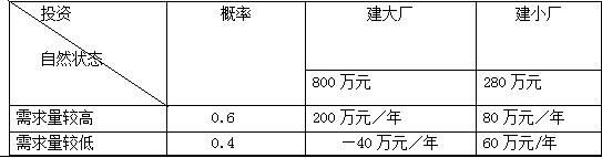 某项目有二个方案:方案一为建大厂、方案二为建小厂、使用期10年、两个方案的投资、每年的损益情况及自然状态的概率见下表、如果投资者能够承受800万元的亏损风险,哪个方案较好。