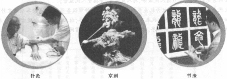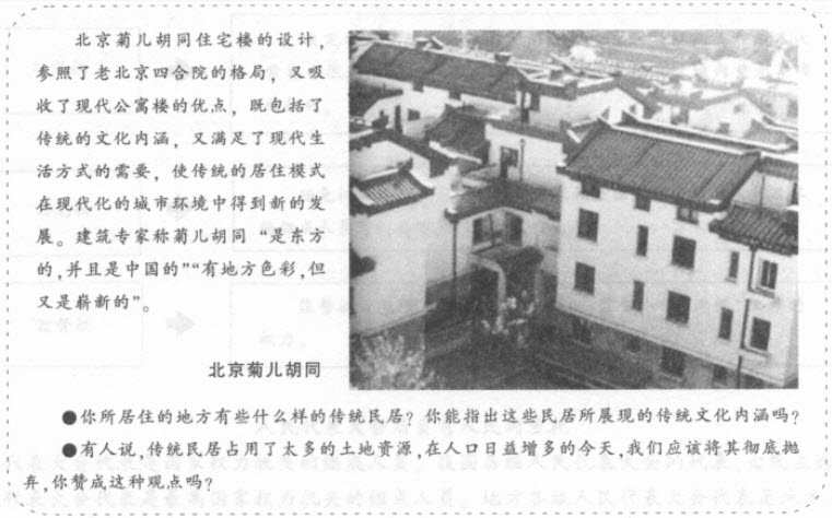●你知道它们的由来吗?如果知道,请说出来与同学们分享。从这些图片中,我们可以看出传统文化具有以下特点: ◇传统文化产生于过去,打上了历史的烙印; ◇传统文化带有自己民族的色彩: ◇传统文化不仅存在于历史中,而且存在于现实中; ◇传统文化渗透在现实生活的各个领域。 ●结合自己的经验。 你还能列举出传统文化的哪些特点?可否用一两个事例加以说明? 传统文化是在长期历史发展中形成并保留在现实生活中的、具有相对稳定性的文化。没有文化的继承,就没有文化的积累。从传统习俗等在社会生活各方面的延续中,我们可以感受到文化的继承性。 传统习俗的继承。传统习俗是指在一定社会群体中约定俗成、世代相传的风尚、礼节和习惯。传统习俗,对人们的物质生活和精神生活产生持久的影响,是传统文化的基本形式之一。 传统建筑的继承。建筑,被称为凝固的艺术。中国古代建筑以其独特的结构体系、优美的艺术造型、丰富的艺术装饰,在世界建筑史上写下了光辉的一页,并成为展现中国传统文化的重要标志。