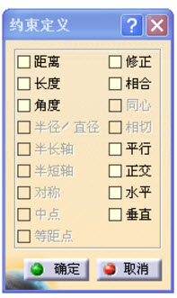 在绘制平面草图时,不仅可以对图形进行尺寸约束,而且可以对图形进行几何约束。请说明,使用在对话框中定义约束时,如图所示,其中相合、正交、垂直分别代表什么意义。如果选中了相合,那么还能使用其它选项吗?为什么?