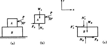 图示物块A和B叠放在水平固定面上。物块A与B之间的摩擦系数为f1=0.20(动摩擦系数可近似取此值)。物块B与固定面间的摩擦系数为f2=0.250物块A重WA=10N,物块B重WB=20N。若在物块A上施加力P=3N,则物块A和B能否保持平衡状态应为()。