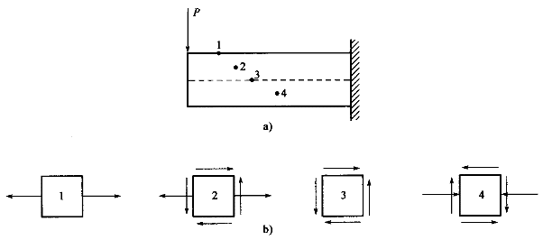 题图a)所示悬臂梁,给出了1、2、3、4点处的应力状态如题图b)所示,其中应力状态错误的位置点是:()
