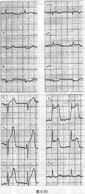患者女性,58岁,反复发作胸痛1周,每次持续数分钟自行缓解。患者胸痛时的心电图见图5-30,应考虑为()。