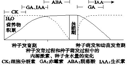 下图为种子发育过程和种子萌发过程中内源激素、种子含水量以及营养物质积累量的变化,据图分析,在种子发育过程中有关植物激素的作用