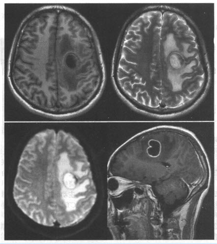 患者,男,47岁。低热、头痛半个月余,MRI检查如图。