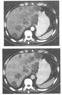 男,72岁,胆石症史多年。1个月来发热,上腹疼痛,CT扫描如下图,显示肝脏内多个直径10~30mm低密度灶,CT值20HU,边缘呈环状强化,最有可能的诊断是()