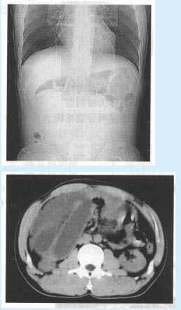 患者,男,35岁。急性腹痛,呕吐,腹胀,面色苍白入院,行平片及CT检查,如图。