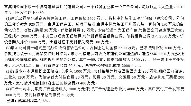 要求:根据上述资料,回答下列问题(除不尽保留两位小数): (1)该建筑公司3月份应缴纳的营业税为()万元。 (2)该集团公司销售办公楼和对外投资业务应缴纳的营业税为()万元。 (3)该旅游公司应缴纳的营业税为()万元。 (4)该广告公司应缴纳的营业税为()万元。