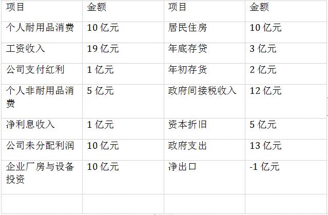 根据下列给出的数字,用收入法计算GDP。GDP=工资收入+红利+净利息+未分配利润十间接税+资本折旧=19亿元+1亿元+1亿元+10亿元+12亿元+5亿元=48亿元。