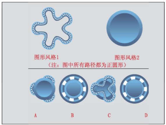 在图形样式调板中包含两个图形风格,图形样式1使用了一个图案笔刷,图形样式2运用了两个渐变填充和一个偏移路径效果,图中上排是两个图形风格分别运用到两个相同的圆形路径产生的视觉外观。 现在如果选择两个图形样式,执行图形样式调板菜单中的“合并图形样式”,得到第三个图形风格,将它运用到第三个圆形路径(稍小)后,得到的效果应该是ABCD中哪一个?()