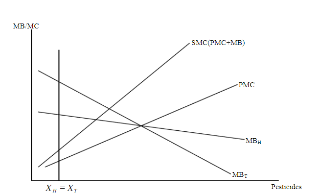 如果有两个农夫:Tony和Hakim,如下图所示,他们都使用农药DDT。使用DDT会导致在流经农场河流下游的游泳者受损。 (1)画图表示每个农夫最优的杀虫剂使用量。 (2)如果考虑外部性,画图表示他们最优的杀虫剂使用量。 (3)为什么让两人使用的杀虫剂相等并不社会最优的结果?