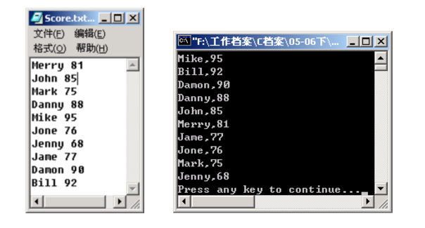已知文件Score.txt中列出了10个同学的姓名及其C程序设计成绩(如下左图所示),要求取出这些同学的姓名和成绩,然后在屏幕上按成绩从高到低排序输出(如下右图所示)。