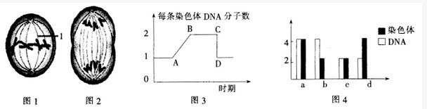 图1、图2分别表示某种生物细胞有丝分裂过程中某一时期的模式图,图3表示有丝分裂中不同时期每条染色体上DNA分子数的变化,图4表示有丝分裂中不同时期染色体和DNA的数量关系,下列有关叙述