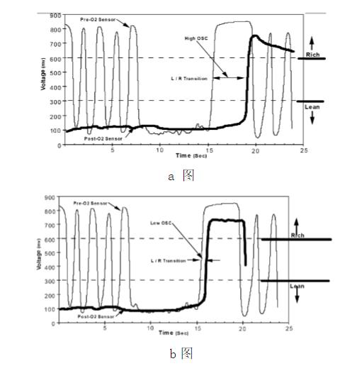 下图为在2两种情况下、同一车型不同车辆上,测得的前(细实线)后(粗实线)氧传感器电压波形,分析哪个图中对应的三元催化储氧能力更强,转化器性能更好,为什么?(图中OSC为储氧能力,Pre-O