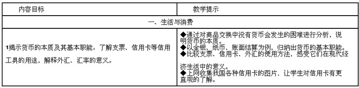 《普通高中思想政治课程标准(实验)》对必修课程和选修课程中的各个模块的内容标准提出了教学的基本要求。四个必修模块内容标准以表格形式体现。每个模块都有一段文字说明本模块的教学基本目标,并分单元分别提出“内容目标”和“提示与建议”。“内容目标”主要列出教学内容和教学目标,“提示与建议”主要是对一些教学的重点和难点进行提示,并对教学中可采用的方式提出建议。《经济生活》第一课《神奇的货币》的内容标准如下: 请结合《经济生活》第一课《神奇的货币》的内容标准回答: