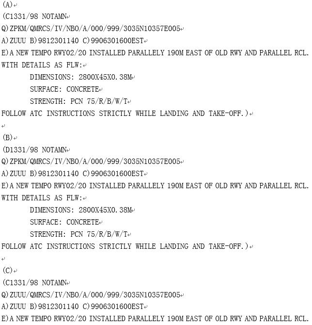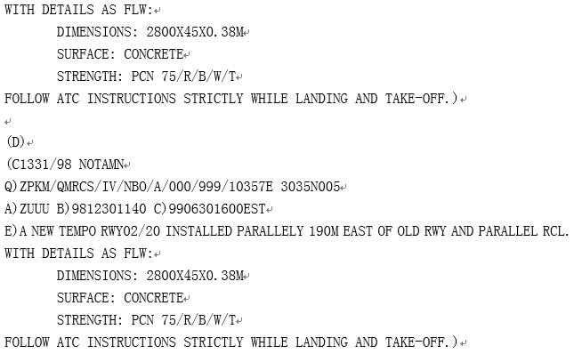 成都双流机场,自98年12月30日11时40分预计至99年6月30日16时,在老跑道东侧190米处,平行于老跑道,铺设一条新临时跑道,具体数据如下:尺寸:2800×45×0.38m,道面类型:水泥,道面强度:PCN75/R/B/W/T,起降时请严格遵守管制指令,发布C1331/98。()