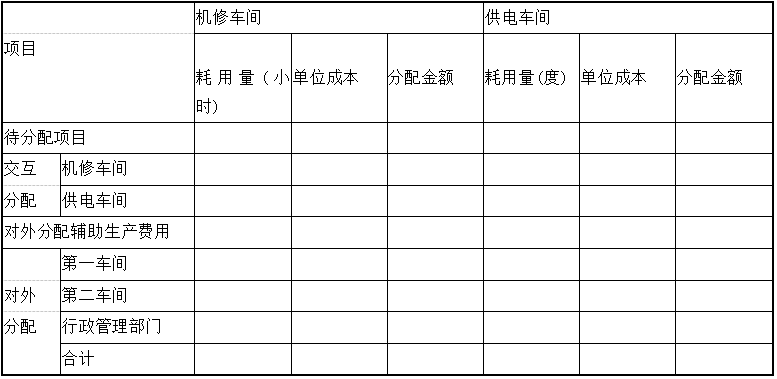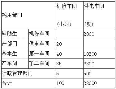 3)机修车间本月发生生产费用6500元,提供维修服务100小时;供电车间本月发生生产费用8800元,提供电力22000度。各部门耗用辅助生产车间产品或服务的情况如下: